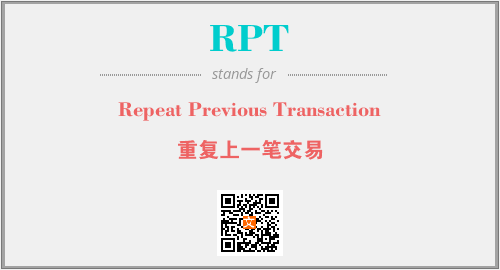 英文缩略词“RPT”经常作为“Repeat Previous Transaction”的英文缩写来使用,中文表示:“重复上一笔交易”。本文将详细介绍英文缩写词RPT所代表英文单词,其对应的中文拼音、详细解释以及在英语中的流行度。此外,还有关于缩略词RPT的分类、应用领域及相关应用示例等。