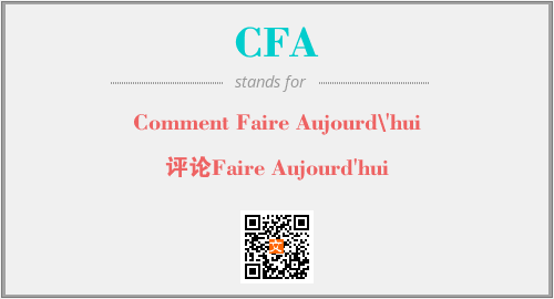 英文缩略词“CFA”经常作为“Comment Faire Aujourd\'hui”的英文缩写来使用,中文表示:“评论Faire Aujourd'hui”。本文将详细介绍英文缩写词CFA所代表英文单词,其对应的中文拼音、详细解释以及在英语中的流行度。此外,还有关于缩略词CFA的分类、应用领域及相关应用示例等。