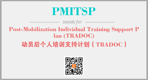 英文缩略词“PMITSP”经常作为“Post-Mobilization Individual Training Support Plan (TRADOC)”的英文缩写来使用,中文表示:“动员后个人培训支持计划(TRADOC)”。本文将详细介绍英文缩写词PMITSP所代表英文单词,其对应的中文拼音、详细解释以及在英语中的流行度。此外,还有关于缩略词PMITSP的分类、应用领域及相关应用示例等。