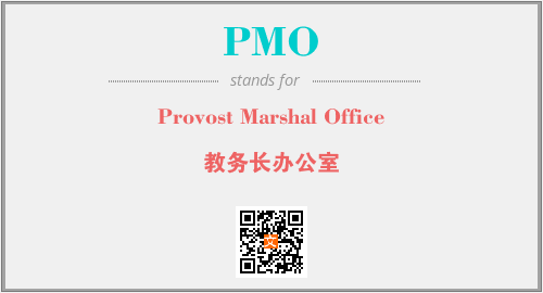 英文缩略词“PMO”经常作为“Provost Marshal Office”的英文缩写来使用,中文表示:“教务长办公室”。本文将详细介绍英文缩写词PMO所代表英文单词,其对应的中文拼音、详细解释以及在英语中的流行度。此外,还有关于缩略词PMO的分类、应用领域及相关应用示例等。