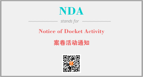 上述内容是“Notice of Docket Activity”作为“NDA”的缩写,解释为“案卷活动通知”时的信息,以及英文缩略词NDA所代表的英文单词,其对应的中文拼音、详细解释以及在英文中的流行度和相关分类、应用领域及应用示例等。
