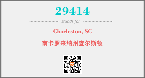 上述内容是“Charleston, SC”作为“29414”的缩写,解释为“南卡罗来纳州查尔斯顿”时的信息,以及英文缩略词29414所代表的英文单词,其对应的中文拼音、详细解释以及在英文中的流行度和相关分类、应用领域及应用示例等。