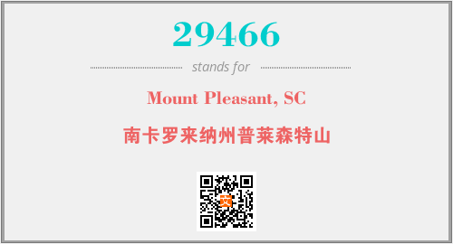 上述内容是“Mount Pleasant, SC”作为“29466”的缩写,解释为“南卡罗来纳州普莱森特山”时的信息,以及英文缩略词29466所代表的英文单词,其对应的中文拼音、详细解释以及在英文中的流行度和相关分类、应用领域及应用示例等。