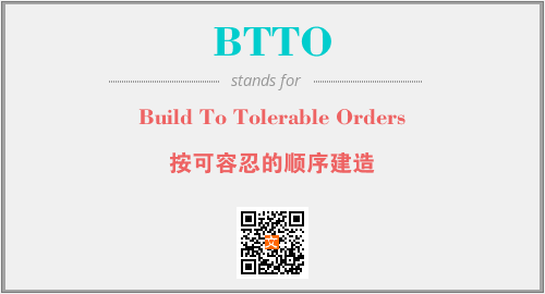 英文缩略词“BTTO”经常作为“Build To Tolerable Orders”的英文缩写来使用,中文表示:“按可容忍的顺序建造”。本文将详细介绍英文缩写词BTTO所代表英文单词,其对应的中文拼音、详细解释以及在英语中的流行度。此外,还有关于缩略词BTTO的分类、应用领域及相关应用示例等。