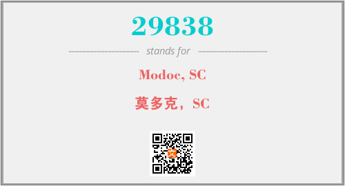 上述内容是“Modoc, SC”作为“29838”的缩写,解释为“莫多克,SC”时的信息,以及英文缩略词29838所代表的英文单词,其对应的中文拼音、详细解释以及在英文中的流行度和相关分类、应用领域及应用示例等。