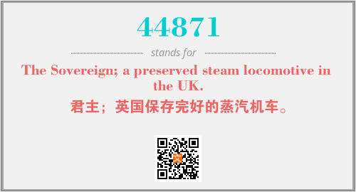 上述内容是“The Sovereign; a preserved steam locomotive in the UK.”作为“44871”的缩写,解释为“君主;英国保存完好的蒸汽机车。”时的信息,以及英文缩略词44871所代表的英文单词,其对应的中文拼音、详细解释以及在英文中的流行度和相关分类、应用领域及应用示例等。