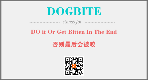英文缩略词“DOGBITE”经常作为“DO it Or Get Bitten In The End”的英文缩写来使用,中文表示:“否则最后会被咬”。本文将详细介绍英文缩写词DOGBITE所代表英文单词,其对应的中文拼音、详细解释以及在英语中的流行度。此外,还有关于缩略词DOGBITE的分类、应用领域及相关应用示例等。