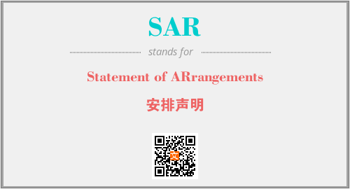 上述内容是“Statement of ARrangements”作为“SAR”的缩写,解释为“安排声明”时的信息,以及英文缩略词SAR所代表的英文单词,其对应的中文拼音、详细解释以及在英文中的流行度和相关分类、应用领域及应用示例等。
