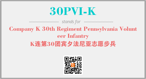 上述内容是“Company K 30th Regiment Pennsylvania Volunteer Infantry”作为“30PVI-K”的缩写,解释为“K连第30团宾夕法尼亚志愿步兵”时的信息,以及英文缩略词30PVI-K所代表的英文单词,其对应的中文拼音、详细解释以及在英文中的流行度和相关分类、应用领域及应用示例等。