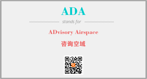英文缩略词“ADA”经常作为“ADvisory Airspace”的英文缩写来使用,中文表示:“咨询空域”。本文将详细介绍英文缩写词ADA所代表英文单词,其对应的中文拼音、详细解释以及在英语中的流行度。此外,还有关于缩略词ADA的分类、应用领域及相关应用示例等。