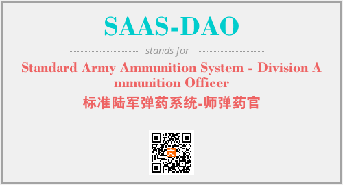 上述内容是“Standard Army Ammunition System - Division Ammunition Officer”作为“SAAS-DAO”的缩写,解释为“标准陆军弹药系统-师弹药官”时的信息,以及英文缩略词SAAS-DAO所代表的英文单词,其对应的中文拼音、详细解释以及在英文中的流行度和相关分类、应用领域及应用示例等。