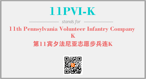 上述内容是“11th Pennsylvania Volunteer Infantry Company K”作为“11PVI-K”的缩写,解释为“第11宾夕法尼亚志愿步兵连K”时的信息,以及英文缩略词11PVI-K所代表的英文单词,其对应的中文拼音、详细解释以及在英文中的流行度和相关分类、应用领域及应用示例等。