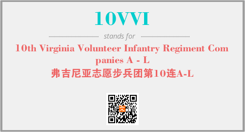 上述内容是“10th Virginia Volunteer Infantry Regiment Companies A - L”作为“10VVI”的缩写,解释为“弗吉尼亚志愿步兵团第10连A-L”时的信息,以及英文缩略词10VVI所代表的英文单词,其对应的中文拼音、详细解释以及在英文中的流行度和相关分类、应用领域及应用示例等。