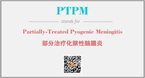 英文缩略词“PTPM”经常作为“Partially-Treated Pyogenic Meningitis”的英文缩写来使用,中文表示:“部分治疗化脓性脑膜炎”。本文将详细介绍英文缩写词PTPM所代表英文单词,其对应的中文拼音、详细解释以及在英语中的流行度。此外,还有关于缩略词PTPM的分类、应用领域及相关应用示例等。