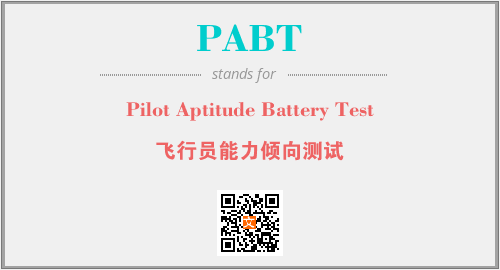 上述内容是“Pilot Aptitude Battery Test”作为“PABT”的缩写,解释为“飞行员能力倾向测试”时的信息,以及英文缩略词PABT所代表的英文单词,其对应的中文拼音、详细解释以及在英文中的流行度和相关分类、应用领域及应用示例等。