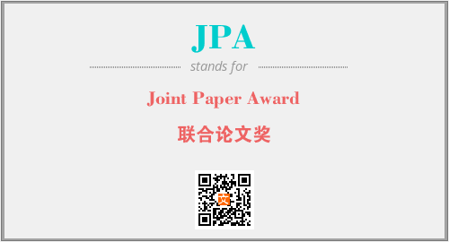 上述内容是“Joint Paper Award”作为“JPA”的缩写,解释为“联合论文奖”时的信息,以及英文缩略词JPA所代表的英文单词,其对应的中文拼音、详细解释以及在英文中的流行度和相关分类、应用领域及应用示例等。