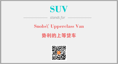 以上为Snobs\' Upperclass Van英文缩略词SUV的中文解释,以及该英文缩写在英语的流行度、分类和应用领域方面的信息。