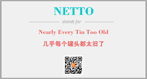 上述内容是“Nearly Every Tin Too Old”作为“NETTO”的缩写,解释为“几乎每个罐头都太旧了”时的信息,以及英文缩略词NETTO所代表的英文单词,其对应的中文拼音、详细解释以及在英文中的流行度和相关分类、应用领域及应用示例等。