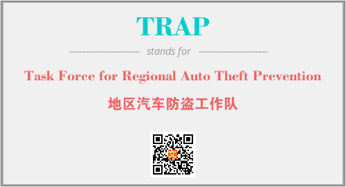 上述内容是“Task Force for Regional Auto Theft Prevention”作为“TRAP”的缩写,解释为“地区汽车防盗工作队”时的信息,以及英文缩略词TRAP所代表的英文单词,其对应的中文拼音、详细解释以及在英文中的流行度和相关分类、应用领域及应用示例等。