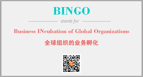 上述内容是“Business INcubation of Global Organizations”作为“BINGO”的缩写,解释为“全球组织的业务孵化”时的信息,以及英文缩略词BINGO所代表的英文单词,其对应的中文拼音、详细解释以及在英文中的流行度和相关分类、应用领域及应用示例等。