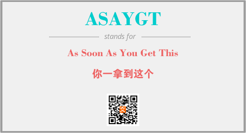 英文缩略词“ASAYGT”经常作为“As Soon As You Get This”的英文缩写来使用,中文表示:“你一拿到这个”。本文将详细介绍英文缩写词ASAYGT所代表英文单词,其对应的中文拼音、详细解释以及在英语中的流行度。此外,还有关于缩略词ASAYGT的分类、应用领域及相关应用示例等。