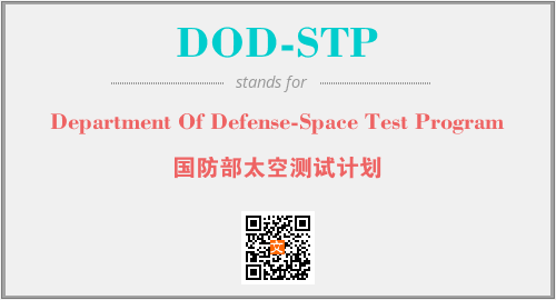 上述内容是“Department Of Defense-Space Test Program”作为“DOD-STP”的缩写,解释为“国防部太空测试计划”时的信息,以及英文缩略词DOD-STP所代表的英文单词,其对应的中文拼音、详细解释以及在英文中的流行度和相关分类、应用领域及应用示例等。