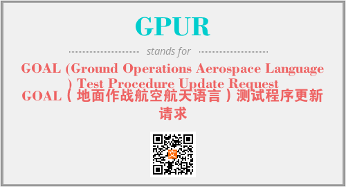 上述内容是“GOAL (Ground Operations Aerospace Language) Test Procedure Update Request”作为“GPUR”的缩写,解释为“GOAL(地面作战航空航天语言)测试程序更新请求”时的信息,以及英文缩略词GPUR所代表的英文单词,其对应的中文拼音、详细解释以及在英文中的流行度和相关分类、应用领域及应用示例等。