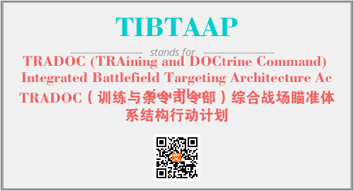 上述内容是“TRADOC (TRAining and DOCtrine Command) Integrated Battlefield Targeting Architecture Action Plan”作为“TIBTAAP”的缩写,解释为“TRADOC(训练与条令司令部)综合战场瞄准体系结构行动计划”时的信息,以及英文缩略词TIBTAAP所代表的英文单词,其对应的中文拼音、详细解释以及在英文中的流行度和相关分类、应用领域及应用示例等。