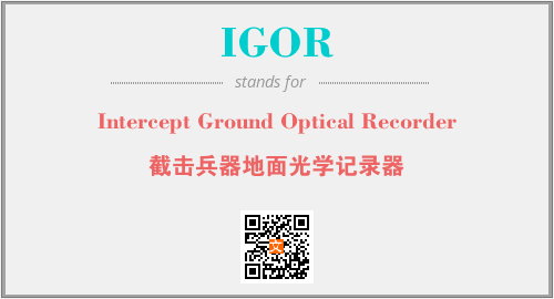 英文缩略词“IGOR”经常作为“Intercept Ground Optical Recorder”的英文缩写来使用,中文表示:“截击兵器地面光学记录器”。本文将详细介绍英文缩写词IGOR所代表英文单词,其对应的中文拼音、详细解释以及在英语中的流行度。此外,还有关于缩略词IGOR的分类、应用领域及相关应用示例等。