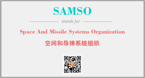 上述内容是“Space And Missile Systems Organization”作为“SAMSO”的缩写,解释为“空间和导弹系统组织”时的信息,以及英文缩略词SAMSO所代表的英文单词,其对应的中文拼音、详细解释以及在英文中的流行度和相关分类、应用领域及应用示例等。