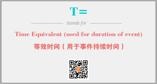 上述内容是“Time Equivalent (used for duration of event)”作为“T=”的缩写,解释为“等效时间(用于事件持续时间)”时的信息,以及英文缩略词T=所代表的英文单词,其对应的中文拼音、详细解释以及在英文中的流行度和相关分类、应用领域及应用示例等。