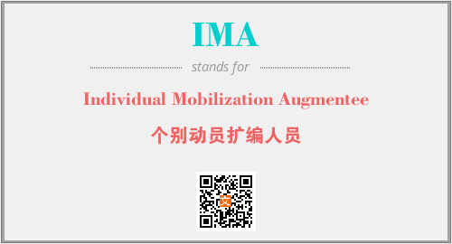 英文缩略词“IMA”经常作为“Individual Mobilization Augmentee”的英文缩写来使用,中文表示:“个别动员扩编人员”。本文将详细介绍英文缩写词IMA所代表英文单词,其对应的中文拼音、详细解释以及在英语中的流行度。此外,还有关于缩略词IMA的分类、应用领域及相关应用示例等。