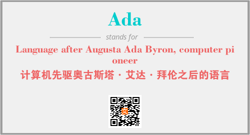 上述内容是“Language after Augusta Ada Byron, computer pioneer”作为“Ada”的缩写,解释为“计算机先驱奥古斯塔·艾达·拜伦之后的语言”时的信息,以及英文缩略词Ada所代表的英文单词,其对应的中文拼音、详细解释以及在英文中的流行度和相关分类、应用领域及应用示例等。