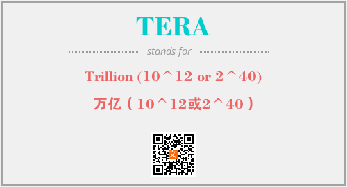 上述内容是“Trillion (10^12 or 2^40)”作为“TERA”的缩写,解释为“万亿(10^12或2^40)”时的信息,以及英文缩略词TERA所代表的英文单词,其对应的中文拼音、详细解释以及在英文中的流行度和相关分类、应用领域及应用示例等。