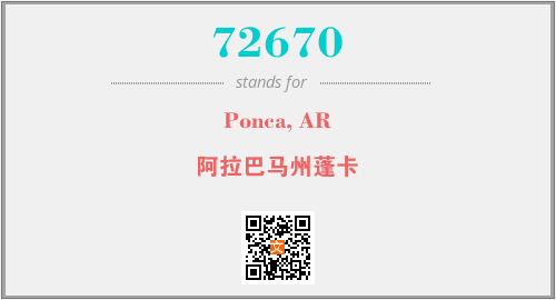 上述内容是“Ponca, AR”作为“72670”的缩写,解释为“阿拉巴马州蓬卡”时的信息,以及英文缩略词72670所代表的英文单词,其对应的中文拼音、详细解释以及在英文中的流行度和相关分类、应用领域及应用示例等。