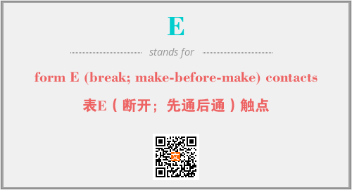 英文缩略词“E”经常作为“form E (break; make-before-make) contacts”的英文缩写来使用,中文表示:“表E(断开;先通后通)触点”。本文将详细介绍英文缩写词E所代表英文单词,其对应的中文拼音、详细解释以及在英语中的流行度。此外,还有关于缩略词E的分类、应用领域及相关应用示例等。