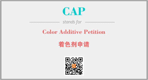 上述内容是“Color Additive Petition”作为“CAP”的缩写,解释为“着色剂申请”时的信息,以及英文缩略词CAP所代表的英文单词,其对应的中文拼音、详细解释以及在英文中的流行度和相关分类、应用领域及应用示例等。