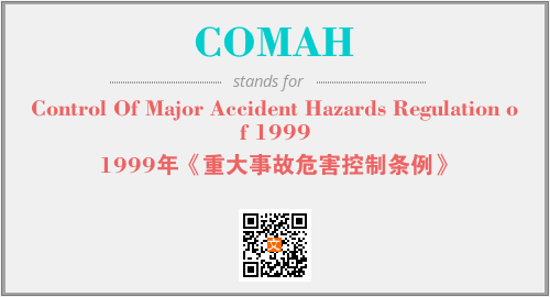 上述内容是“Control Of Major Accident Hazards Regulation of 1999”作为“COMAH”的缩写,解释为“1999年《重大事故危害控制条例》”时的信息,以及英文缩略词COMAH所代表的英文单词,其对应的中文拼音、详细解释以及在英文中的流行度和相关分类、应用领域及应用示例等。