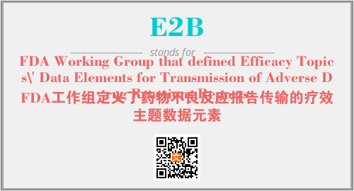 上述内容是“FDA Working Group that defined Efficacy Topics\' Data Elements for Transmission of Adverse Drug Reactions Reports”作为“E2B”的缩写,解释为“FDA工作组定义了药物不良反应报告传输的疗效主题数据元素”时的信息,以及英文缩略词E2B所代表的英文单词,其对应的中文拼音、详细解释以及在英文中的流行度和相关分类、应用领域及应用示例等。