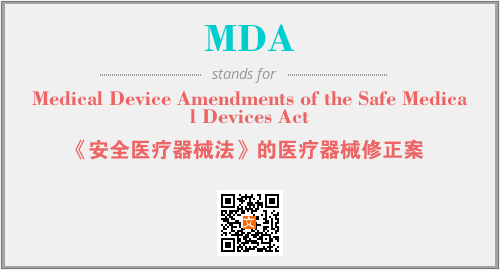 上述内容是“Medical Device Amendments of the Safe Medical Devices Act”作为“MDA”的缩写,解释为“《安全医疗器械法》的医疗器械修正案”时的信息,以及英文缩略词MDA所代表的英文单词,其对应的中文拼音、详细解释以及在英文中的流行度和相关分类、应用领域及应用示例等。