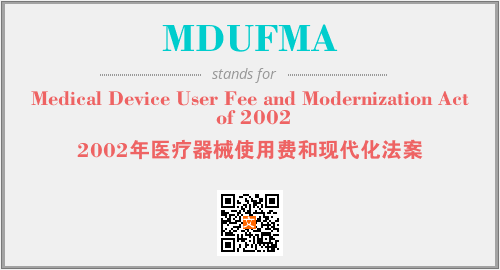 上述内容是“Medical Device User Fee and Modernization Act of 2002”作为“MDUFMA”的缩写,解释为“2002年医疗器械使用费和现代化法案”时的信息,以及英文缩略词MDUFMA所代表的英文单词,其对应的中文拼音、详细解释以及在英文中的流行度和相关分类、应用领域及应用示例等。