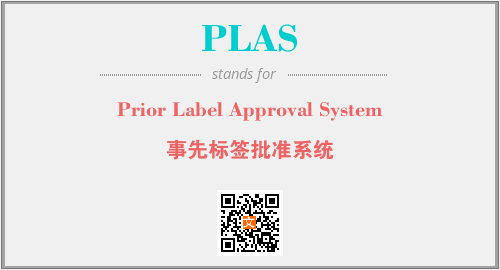英文缩略词“PLAS”经常作为“Prior Label Approval System”的英文缩写来使用,中文表示:“事先标签批准系统”。本文将详细介绍英文缩写词PLAS所代表英文单词,其对应的中文拼音、详细解释以及在英语中的流行度。此外,还有关于缩略词PLAS的分类、应用领域及相关应用示例等。