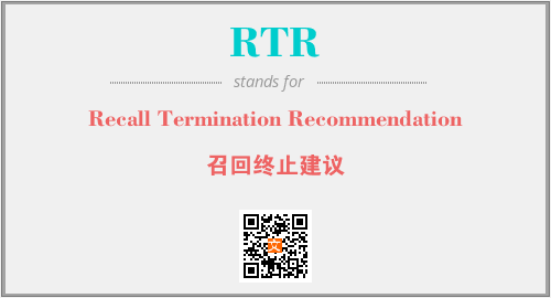 上述内容是“Recall Termination Recommendation”作为“RTR”的缩写,解释为“召回终止建议”时的信息,以及英文缩略词RTR所代表的英文单词,其对应的中文拼音、详细解释以及在英文中的流行度和相关分类、应用领域及应用示例等。