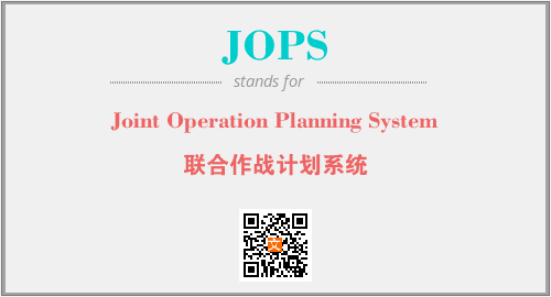 英文缩略词“JOPS”经常作为“Joint Operation Planning System”的英文缩写来使用,中文表示:“联合作战计划系统”。本文将详细介绍英文缩写词JOPS所代表英文单词,其对应的中文拼音、详细解释以及在英语中的流行度。此外,还有关于缩略词JOPS的分类、应用领域及相关应用示例等。