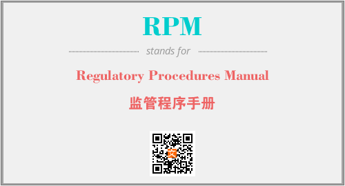 英文缩略词“RPM”经常作为“Regulatory Procedures Manual”的英文缩写来使用,中文表示:“监管程序手册”。本文将详细介绍英文缩写词RPM所代表英文单词,其对应的中文拼音、详细解释以及在英语中的流行度。此外,还有关于缩略词RPM的分类、应用领域及相关应用示例等。