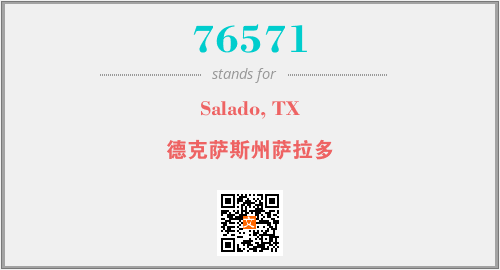 上述内容是“Salado, TX”作为“76571”的缩写,解释为“德克萨斯州萨拉多”时的信息,以及英文缩略词76571所代表的英文单词,其对应的中文拼音、详细解释以及在英文中的流行度和相关分类、应用领域及应用示例等。