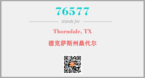 上述内容是“Thorndale, TX”作为“76577”的缩写,解释为“德克萨斯州桑代尔”时的信息,以及英文缩略词76577所代表的英文单词,其对应的中文拼音、详细解释以及在英文中的流行度和相关分类、应用领域及应用示例等。