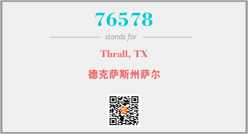 上述内容是“Thrall, TX”作为“76578”的缩写,解释为“德克萨斯州萨尔”时的信息,以及英文缩略词76578所代表的英文单词,其对应的中文拼音、详细解释以及在英文中的流行度和相关分类、应用领域及应用示例等。