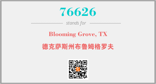 上述内容是“Blooming Grove, TX”作为“76626”的缩写,解释为“德克萨斯州布鲁姆格罗夫”时的信息,以及英文缩略词76626所代表的英文单词,其对应的中文拼音、详细解释以及在英文中的流行度和相关分类、应用领域及应用示例等。