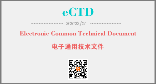 英文缩略词“eCTD”经常作为“Electronic Common Technical Document”的英文缩写来使用,中文表示:“电子通用技术文件”。本文将详细介绍英文缩写词eCTD所代表英文单词,其对应的中文拼音、详细解释以及在英语中的流行度。此外,还有关于缩略词eCTD的分类、应用领域及相关应用示例等。